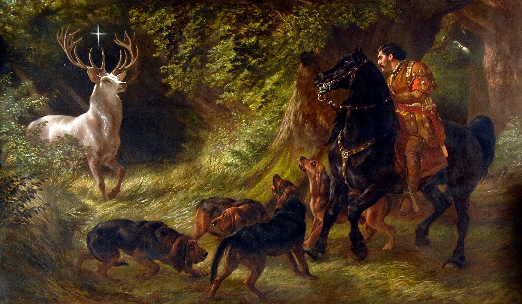 Na etykiecie trunku widnieje głowa jelenia ze świecącym krzyżem między porożem. Jest to istne nawiązanie do historii żywotu świętego Huberta, patrona myśliwych. Hubert był potomkiem rodu Merowingów, a zamiłowanie do łowiectwa przejął po ojcu, któremu już w wieku 14 lat uratował życie podczas polowania na niedźwiedzia. Według źródeł Hubert prowadził bardzo swawolny i hulaszczy tryb życia, lubując się w przeróżnych trunkach, spożywania których nie zwykł odmawiać. Przed polowaniem i spożyciem trunku nie odwiódł Huberta nawet tak postny dzień jak Wielki Piątek, kiedy to według legendy napotkał białego jelenia ze świecącym krzyżem pomiędzy porożem. Miał wtedy usłyszeć głos stwórcy nakazujący mu odrzucenie dotychczasowego życia i oddanie się służbie Bogu. Tak właśnie rozpoczęło się nawrócenie dziś już świętego Huberta. Dziś atrybuty św. Huberta, czyli biały byk z jaśniejącym krzyżem pomiędzy porożem nie tylko wykorzystane zostały w logo Jagermeistera, ale także stały się symbolem Polskiego Związku Łowieckiego!